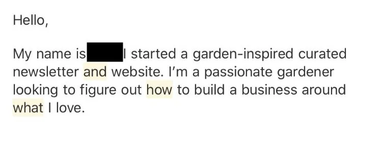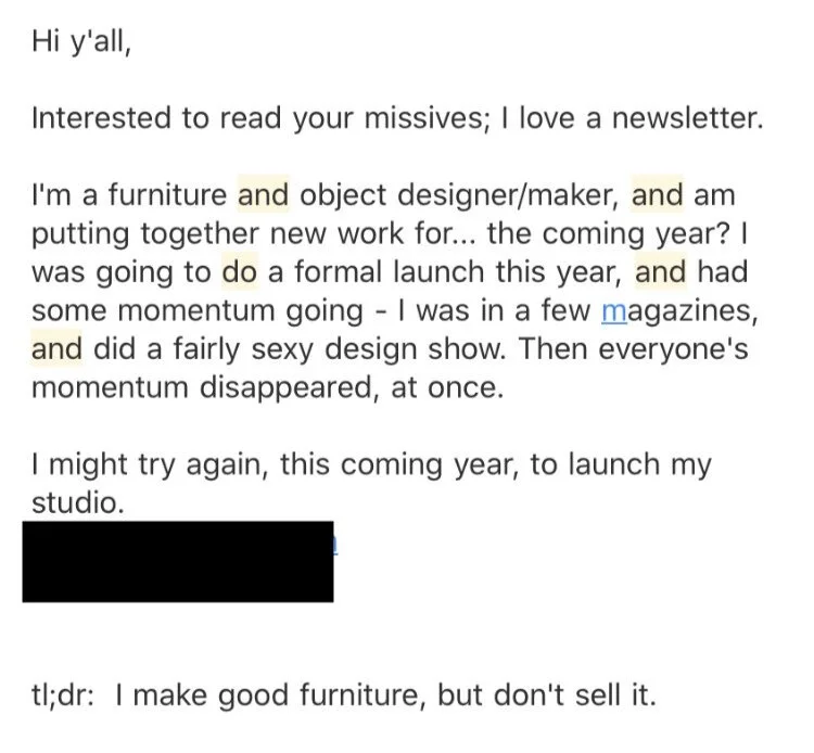 “We’ve looked at several past issues and it looks like you have a lot of great resources and links but they get a bit lost in the formatting (aka, all the text is the same size, there aren’t any headings, line breaks or images). This has been studied a lot and humans have preferences for how they digest text, make sure you’re designing your content so it appeals to those preferences. We think creating hierarchy and wayfinding are going to be really important to better structure your content. We’re all for text-based design, or minimal designed newsletters, but make sure you’re designing so your readers can easily digest your work. One great example of this is swiss miss’s newsletter. I would also check out For The Interested and A Thing Or Two.